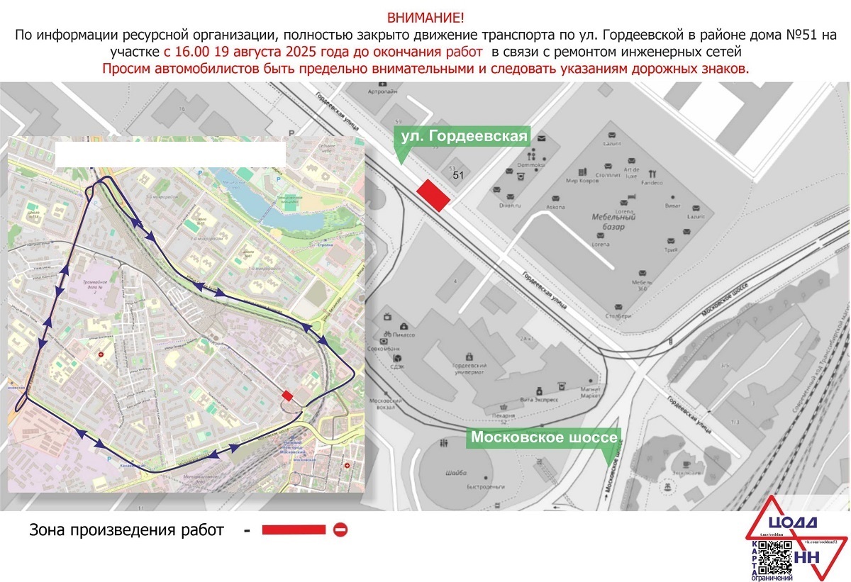 В Нижнем Новгороде временно прекращено движение на участке дороги по улице Гордеевской в районе дома №51. Об этом сообщает пресс-служба администрации Нижнего Новгорода.