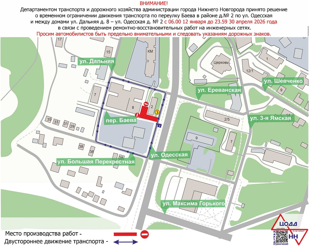 Ремонтно-восстановительные работы пройдут на участке в районе дома №2 по улице Одесской и между домами №8 по улице Дальней и №2 по улице Одесской. Проезд по переулку Баева будет закрыт, объезд организуют по прилегающим улицам.