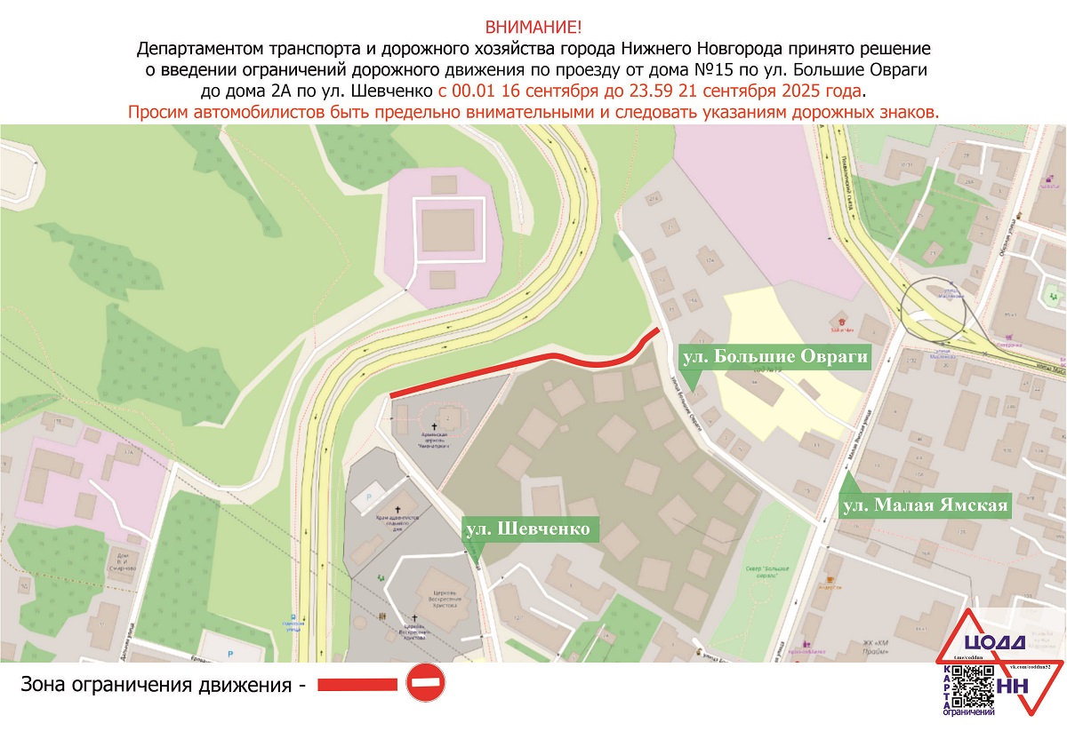 «С 00:01 16 сентября до 23:59 21 сентября 2025 года в Нижнем Новгороде будет временно ограничено движение транспорта на участке от дома №15 по улице Большие Овраги до дома №2А по улице Шевченко (у церкви Сурб Аменапркич) в связи с проведением мероприятия», — уточняется в сообщении.
