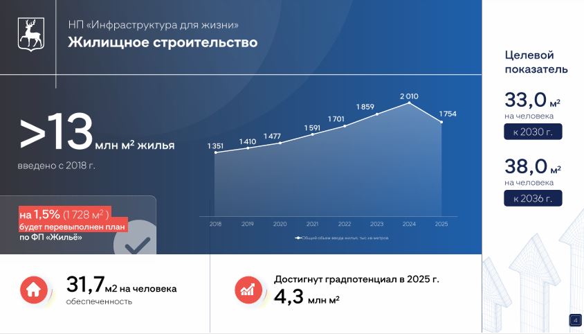 Нижегородская область по итогам 2025 года выполнит план по вводу жилья. Об этом сообщил заместитель губернатора Нижегородской области Сергей Морозов, выступая на заседании регионального правительства с отчетом о реализации нацпроекта «Инфраструктура для жизни».