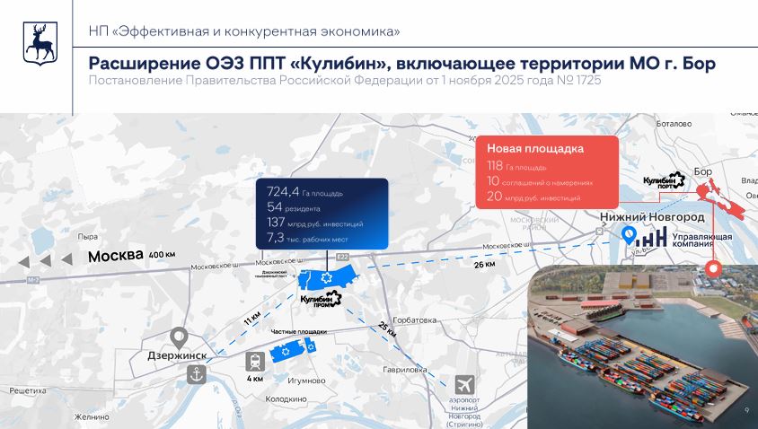 Напомним, 1 ноября правительство РФ одобрило увеличение площади ОЭЗ «Кулибин» на 118 гектаров за счёт борских площадок. Теперь общая площадь зоны составляет 842 гектара. Всего резидентами ОЭЗ являются 54 организации, 9 из них уже запустили свои производства.