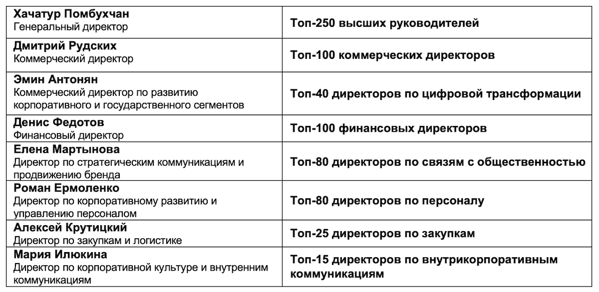 Также в тройку лучших вошли директор по связям с госорганами Владимир Месропян, директор по правовым вопросам Сергей Переверзев, директор по развитию корпоративного бизнеса Наталья Талдыкина, директор по бренду и маркетинговым коммуникациям Татьяна Гура, директор по складской и транспортной логистике Татьяна Гусева, директор ИТ-инфраструктуры Павел Табашников, руководитель проектов по социальным программам Оксана Туранцева и корпоративный секретарь Дарья Лизунова.