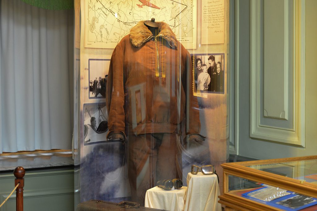 Среди уникальных экспонатов также предметы летного костюма – суконная куртка на беличьем меху и брюки из оленьего меха, покрытые коричневым сукном. Они были специально изготовлены для полета Чкалова на XV Авиационную выставку в Париже в 1936 году.